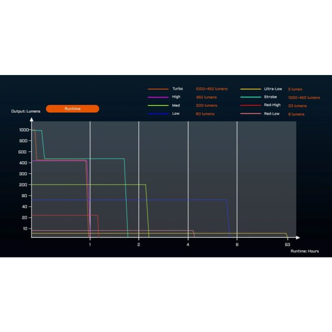 Turbo: 1000 ~ 450 lumens; 12100cd; 220 metres; 2min + 54min