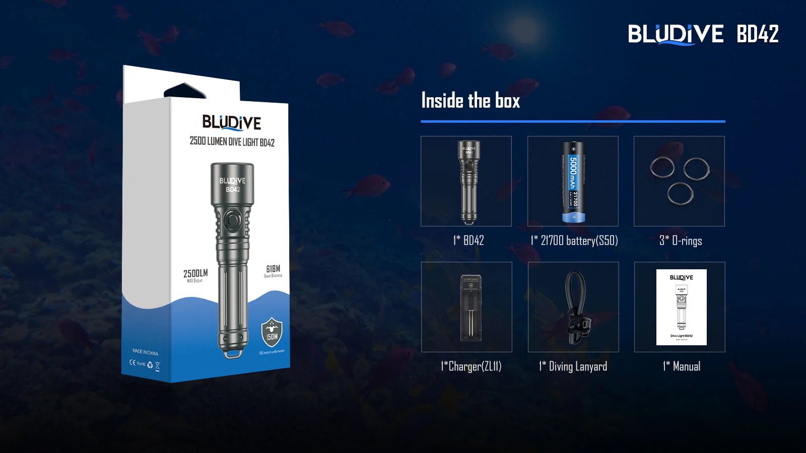 The BluDive BD42 combines strong output, long-range visibility, and rugged underwater performance, making it an ideal lighting tool for divers who need powerful illumination in deep or dark environments.