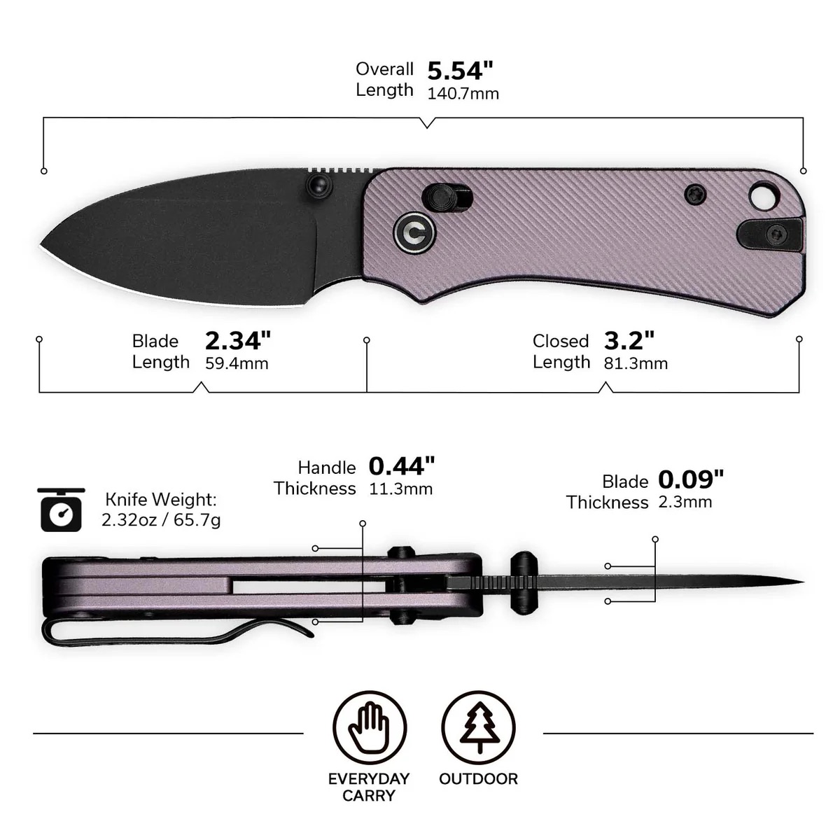 The CIVIVI Baby Banter 2 C23074-2 is a compact and highly functional everyday carry folding knife designed by Ben Petersen. Built for practicality and smooth performance, it features a 2.34″ drop point blade crafted from Nitro-V stainless steel, delivering an excellent balance of edge retention, toughness, and corrosion resistance. The blade is finished with a black stonewash that helps reduce visible wear while maintaining a sleek appearance. Opening is quick and intuitive thanks to ambidextrous thumb studs, while the crossbar lock provides a secure lockup and easy one-handed closing. Despite its compact size, the Baby Banter 2 offers excellent ergonomics with a purple machined aluminum handle that delivers strength, lightweight carry, and a comfortable grip for daily tasks.