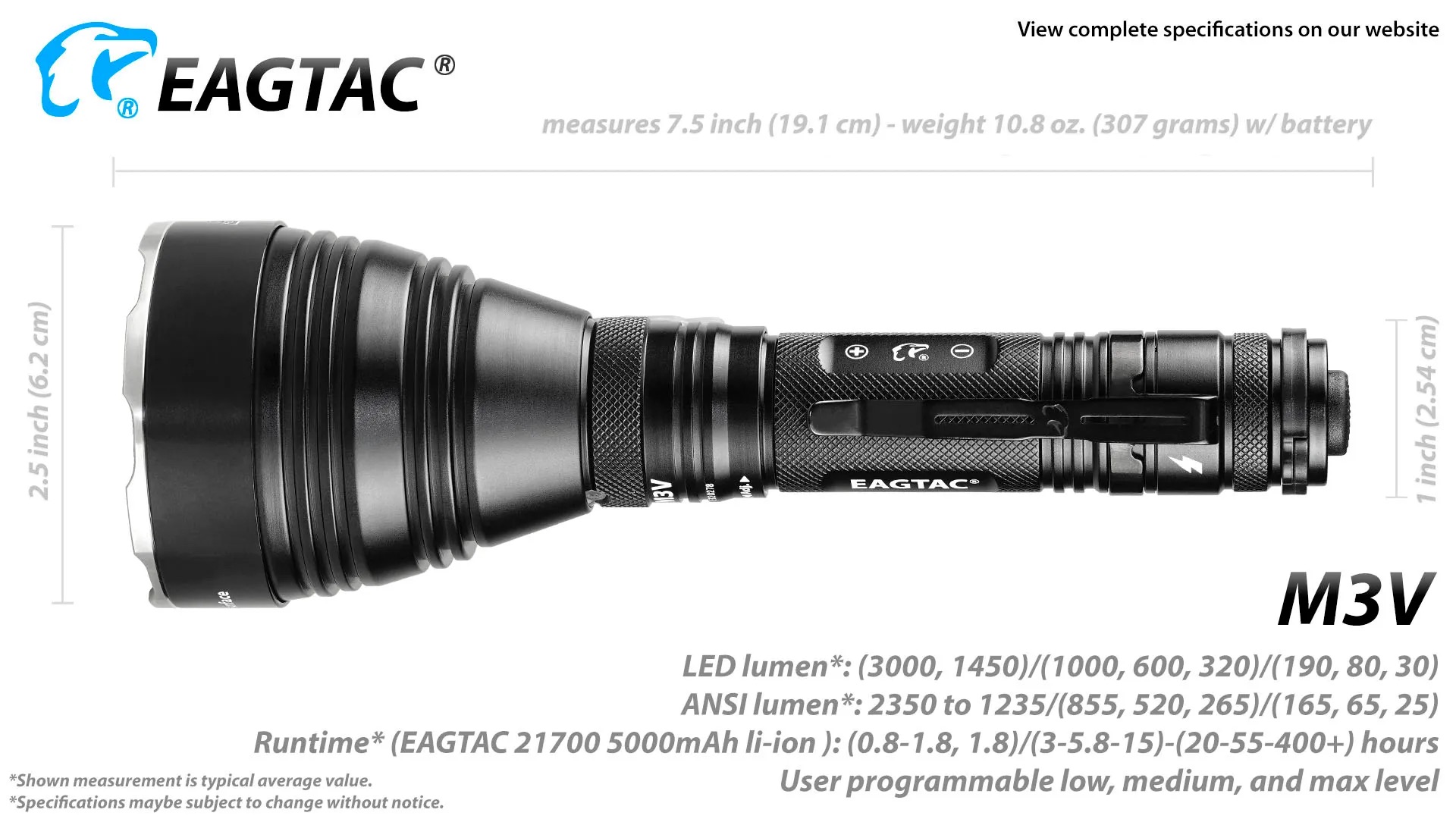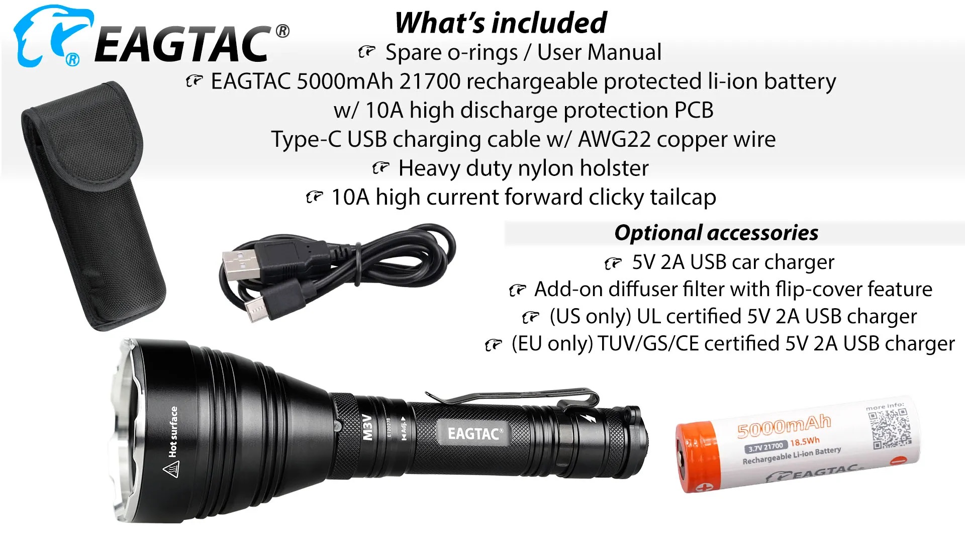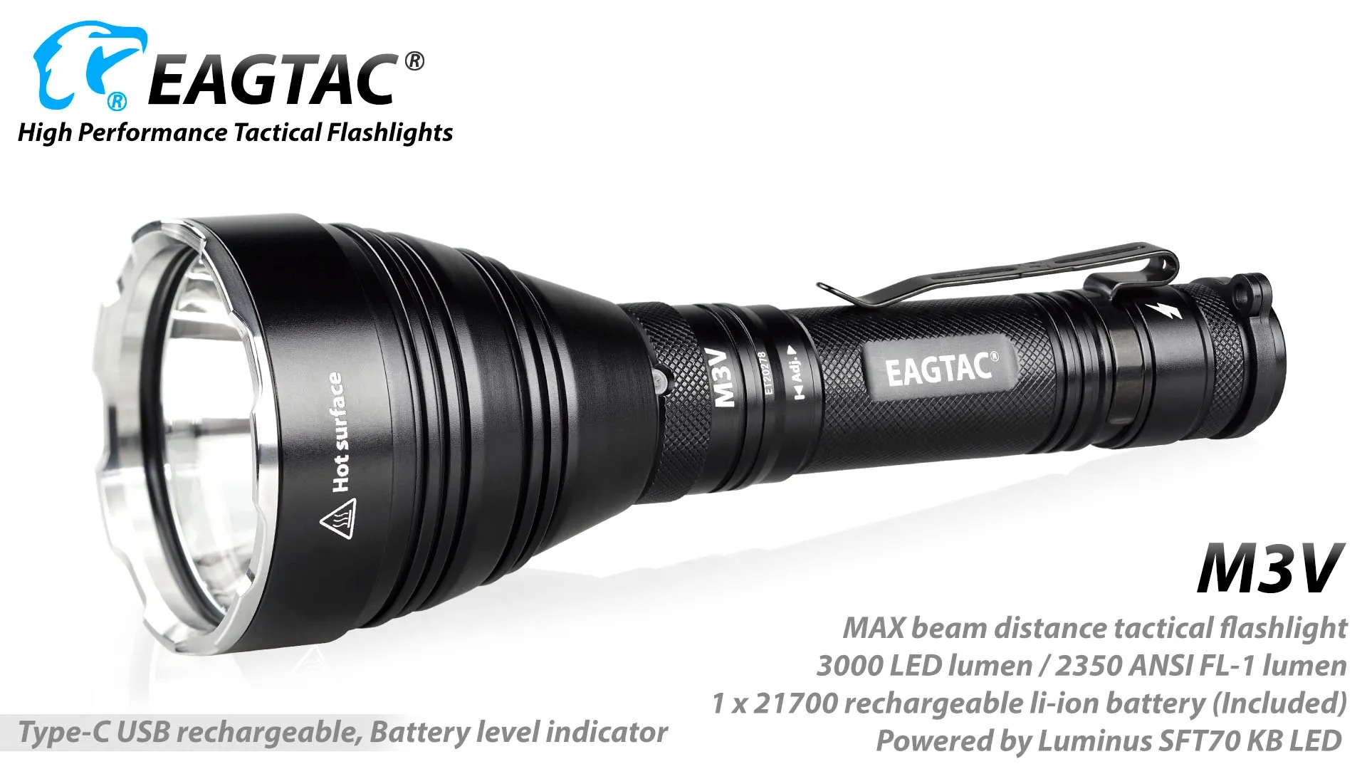 The Eagtac M3V Rechargeable Hunting Torch Kit is built for serious hunters and outdoor professionals who require extreme throw, reliability, and precision lighting. Producing a powerful 3000-lumen output with an impressive beam distance of up to 877 metres, the M3V is ideal for long-range spotting, scanning open terrain, and navigating dense bush in low-light conditions. Crafted from aircraft-grade aluminium with a tough hard-anodised finish, this torch delivers exceptional durability while remaining compact and well balanced in the hand. Advanced thermal regulation and intelligent power management ensure consistent performance during extended use, making it a dependable tool for demanding night-time environments.