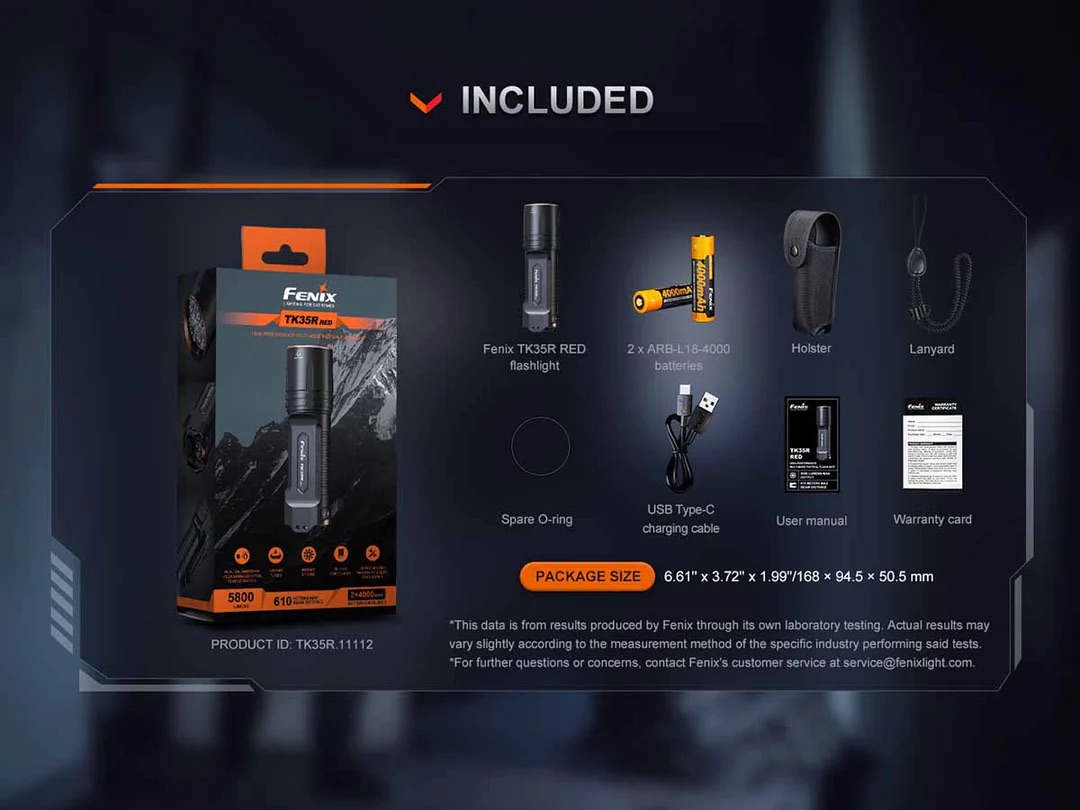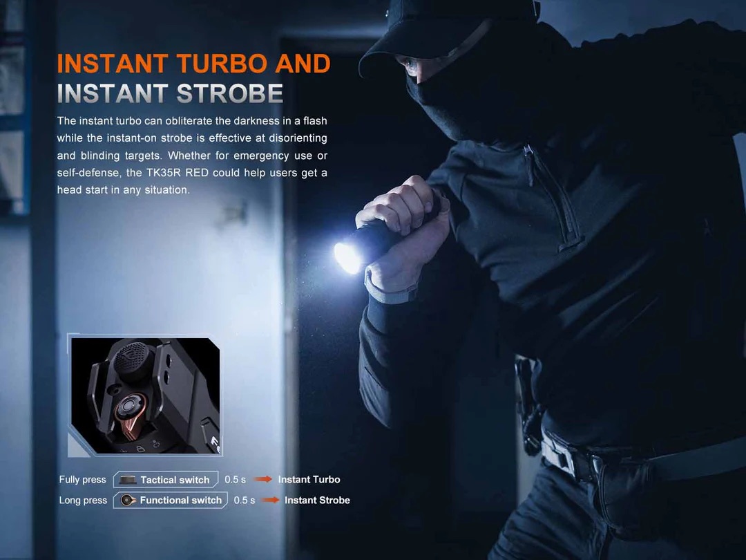 The Fenix TK35R Rechargeable Flashlight is a high-output tactical torch designed for demanding users who need extreme brightness, long-range performance, and flexible lighting options. Delivering an impressive 5800 lumens with a tightly focused beam that reaches up to 610 metres, the TK35R is ideal for search and rescue, security applications, outdoor expeditions, and emergency situations. In addition to its powerful white light output, the flashlight features a dedicated red light mode, perfect for maintaining night vision, low-light navigation, and discreet signalling. Powered by a dual rechargeable battery system and constructed from durable aircraft-grade aluminium, the TK35R is built to perform reliably in tough conditions.