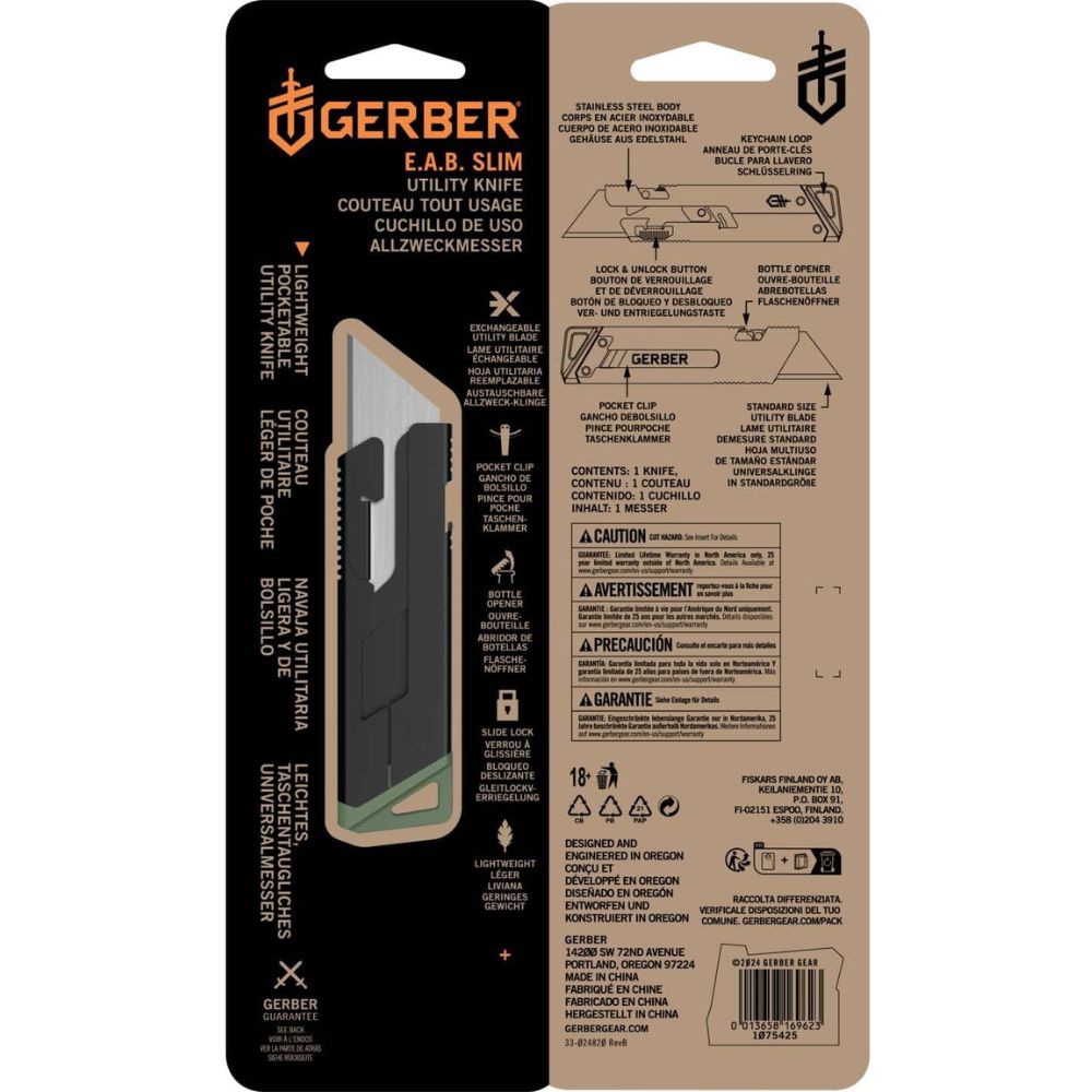 The Gerber EAB Slim Utility Knife is a streamlined and practical everyday carry solution built for real-world cutting tasks. Designed with a slim stainless steel handle and secure liner lock, this compact utility knife offers durability without unnecessary bulk. It uses standard replaceable contractor blades, allowing for quick swaps and hassle-free maintenance. Whether you’re breaking down cartons, cutting packaging, or handling light trade work, the EAB Slim delivers reliable performance in a clean, minimalist design.