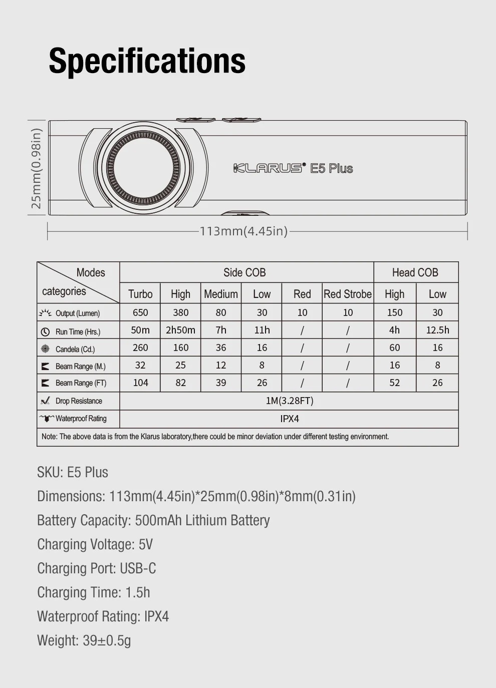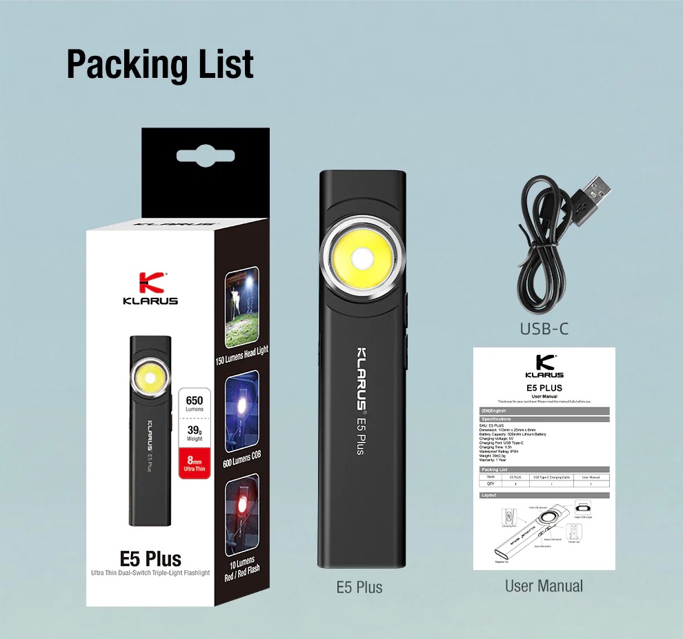 Designed for convenience and everyday reliability, the Klarus E5 Plus offers a balanced combination of brightness, portability, and practical features, making it a dependable lighting tool for both work and daily tasks.