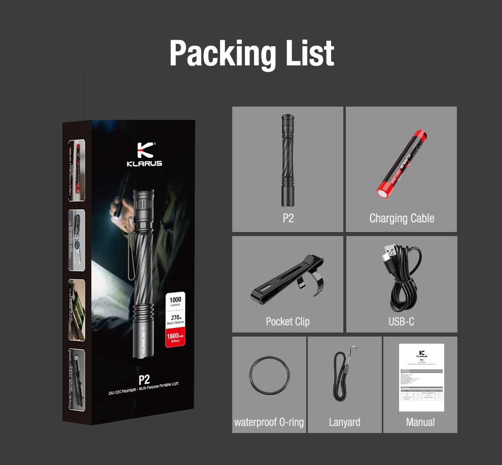 The Klarus P2 is a compact, high-output flashlight engineered for both everyday carry and professional use. Producing up to 1000 lumens and projecting a beam as far as 270 metres, it offers powerful illumination in a sleek, lightweight design. Built to endure demanding environments, the P2 features IPX8 waterproofing and can withstand impacts from up to 1.5 metres, making it a dependable tool for work, outdoor adventures, or emergency situations.