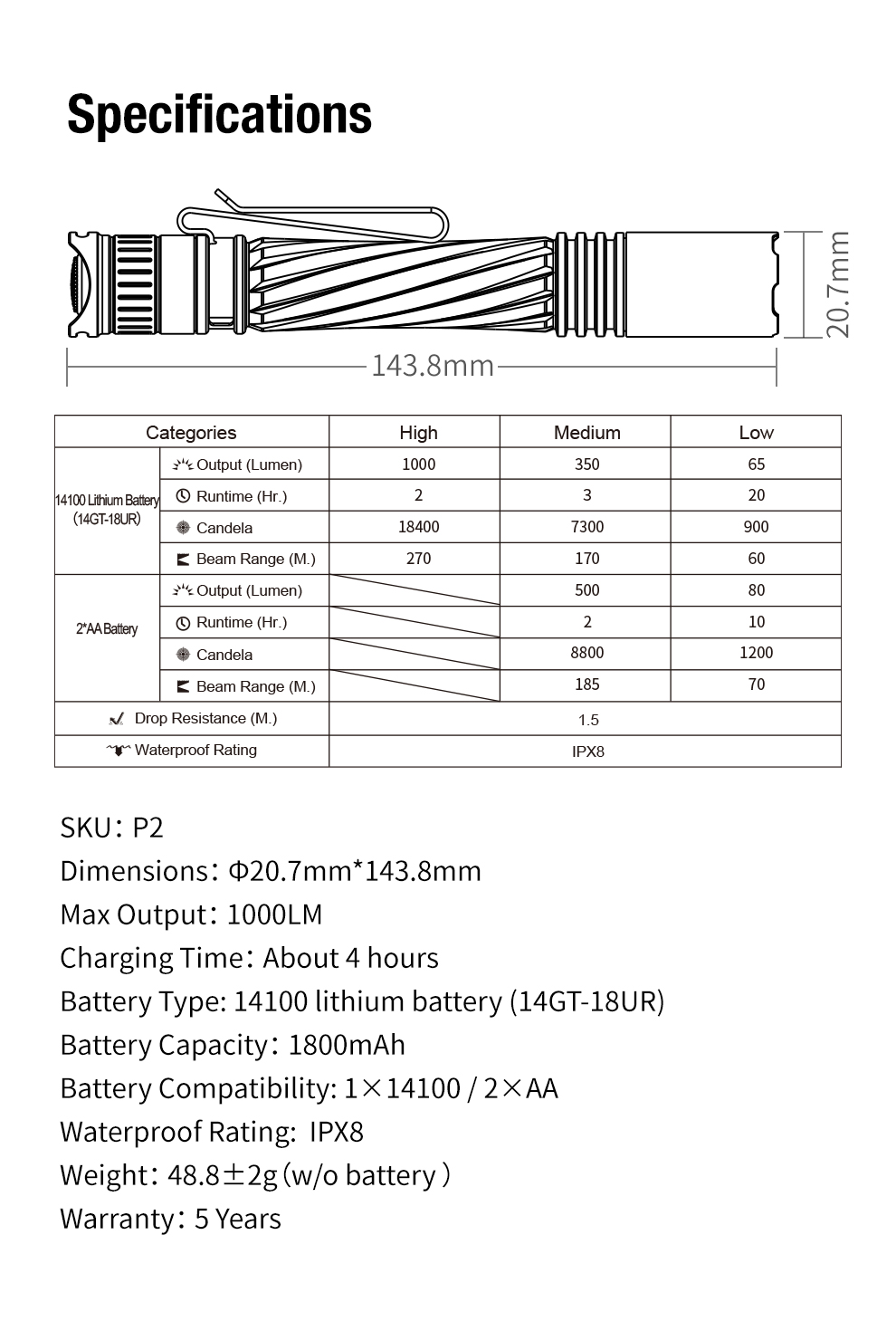Dimensions: φ20.7mm × 143.8mm