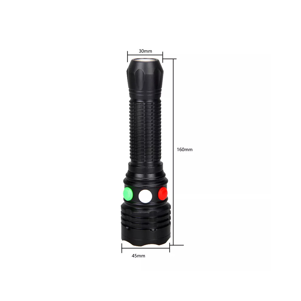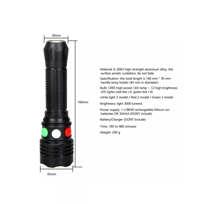 This LED Signal Torch is ideal for road or railway signalling. These torches are the standard tool for large railway companies needing communication between train drivers and rail yard operators. The unit is constructed using high strength aluminium alloy with surface anodic oxidation. It runs on 3x AAA single use batteries (batteries not included), and can produce three modes of white light, two modes of red light, and two modes of green light. Each colour of light is easily operated by a separate push button, so as to avoid accidental activation of undesired colour. It also has a crenulated bezel for self defence, and a magnetic base for the option of hands-free use.