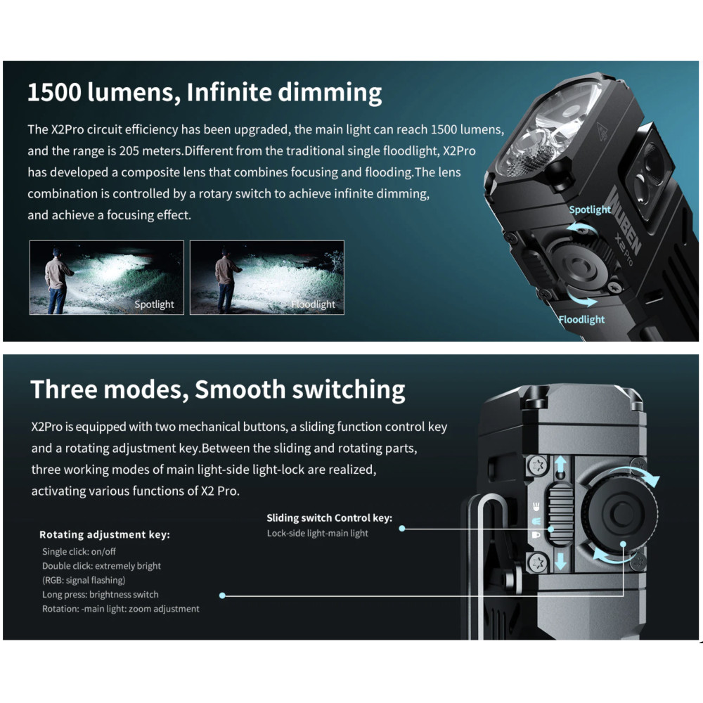 POWERFUL DUAL-LIGHT SYSTEM: WUBEN X2 Pro flashlight features a main light with 4 LED chips, delivering up to 1500 lumens of brightness and a beam distance of up to 205 metres. The main light supports 6 modes: Turbo, High, Medium, Low, Flood, and Spotlight. Additionally, the side light provides 400 lumens of white light and 365nm UV light. The side light also features stepless dimming, allowing you to adjust brightness based on your environment.